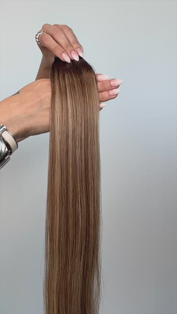 Elevate your look with this Rooted Neutral Blonde single weft extension, featuring a natural root that blends seamlessly into a high-dimensional blonde base. Accented with warm brown highlights, this shade creates depth and movement for a rich, sun-kissed finish. Perfect for adding volume, length, and multi-tonal sophistication, this extension delivers a modern, natural-looking blonde with warmth and dimension.